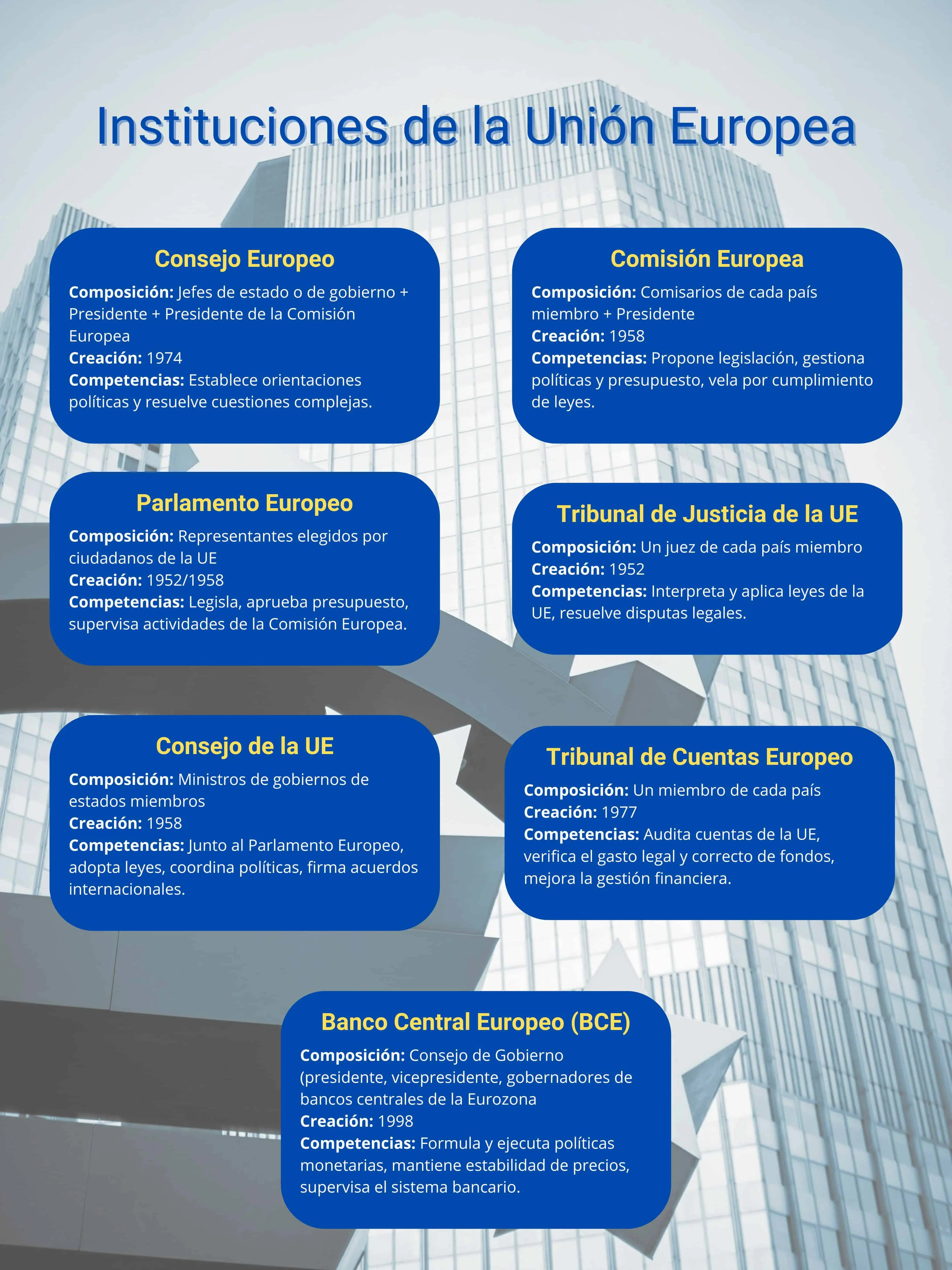 Los principales organismos de la Unión Europea son siete: el Consejo Europeo, la Comisión Europea, el Parlamento Europeo, el Consejo de la Unión Europea, el Tribunal de Justicia de la Unión Europea, el Banco Central Europeo y el Tribunal de Cuentas Europeo.